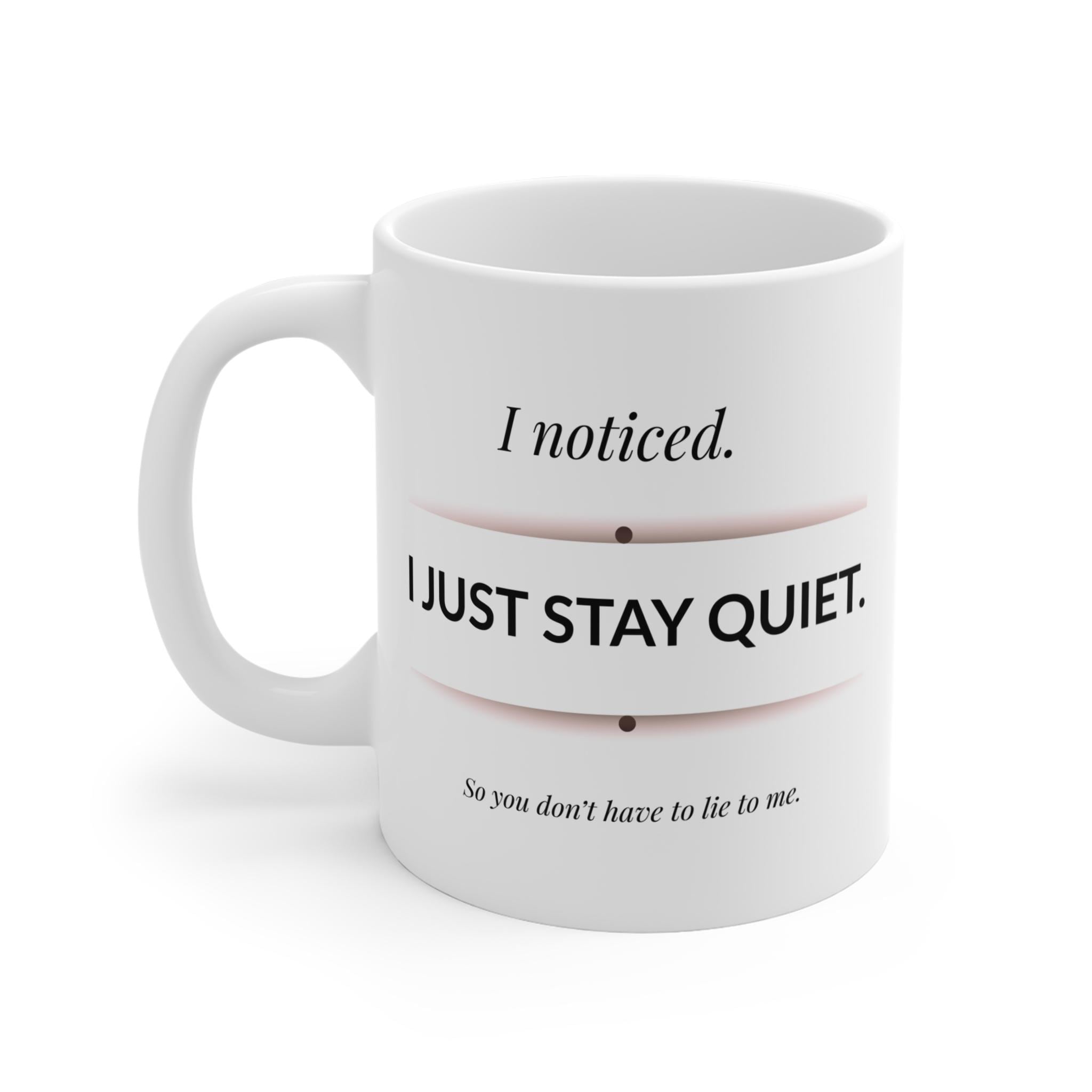A clean white ceramic mug that speaks with quiet confidence. The simple, modern design overlays a soft blush accent and bold, straightforward text: “I noticed. I just stay quiet.” It’s the kind of cup that sits on your desk while you listen, observe, and collect the small truths of the day. Warm coffee in hand, the message is a calm reminder of patience and presence, for the thoughtful, the observant, and anyone who values subtle strength. It slips easily into morning routines, late-night reflections, or slow afternoons with a book.