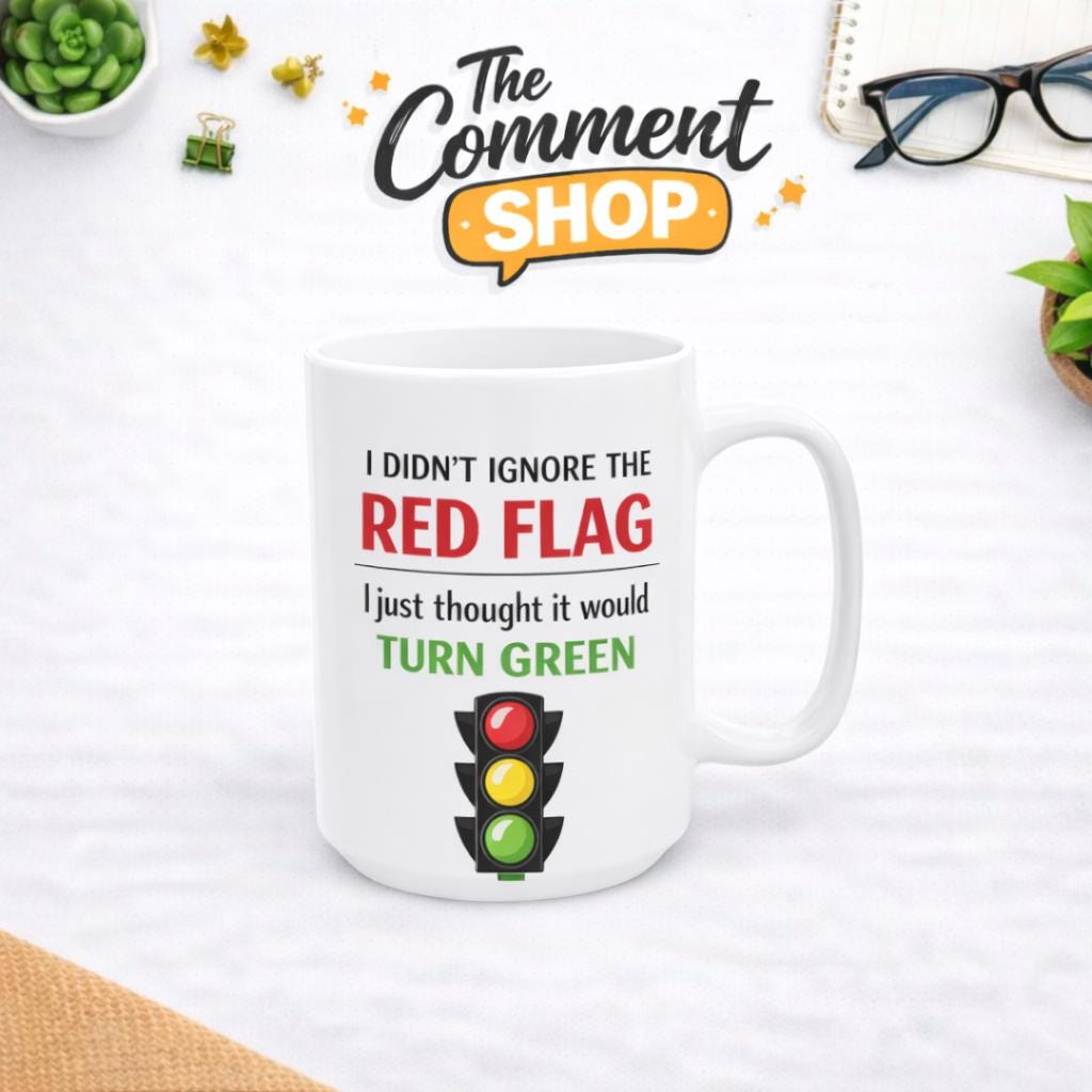 It is witty, self-aware, and painfully relatable for anyone who has ever overlooked obvious warning signs and hoped for the best. The clean layout and color contrast make the message pop while keeping the humor sharp and easy to read.