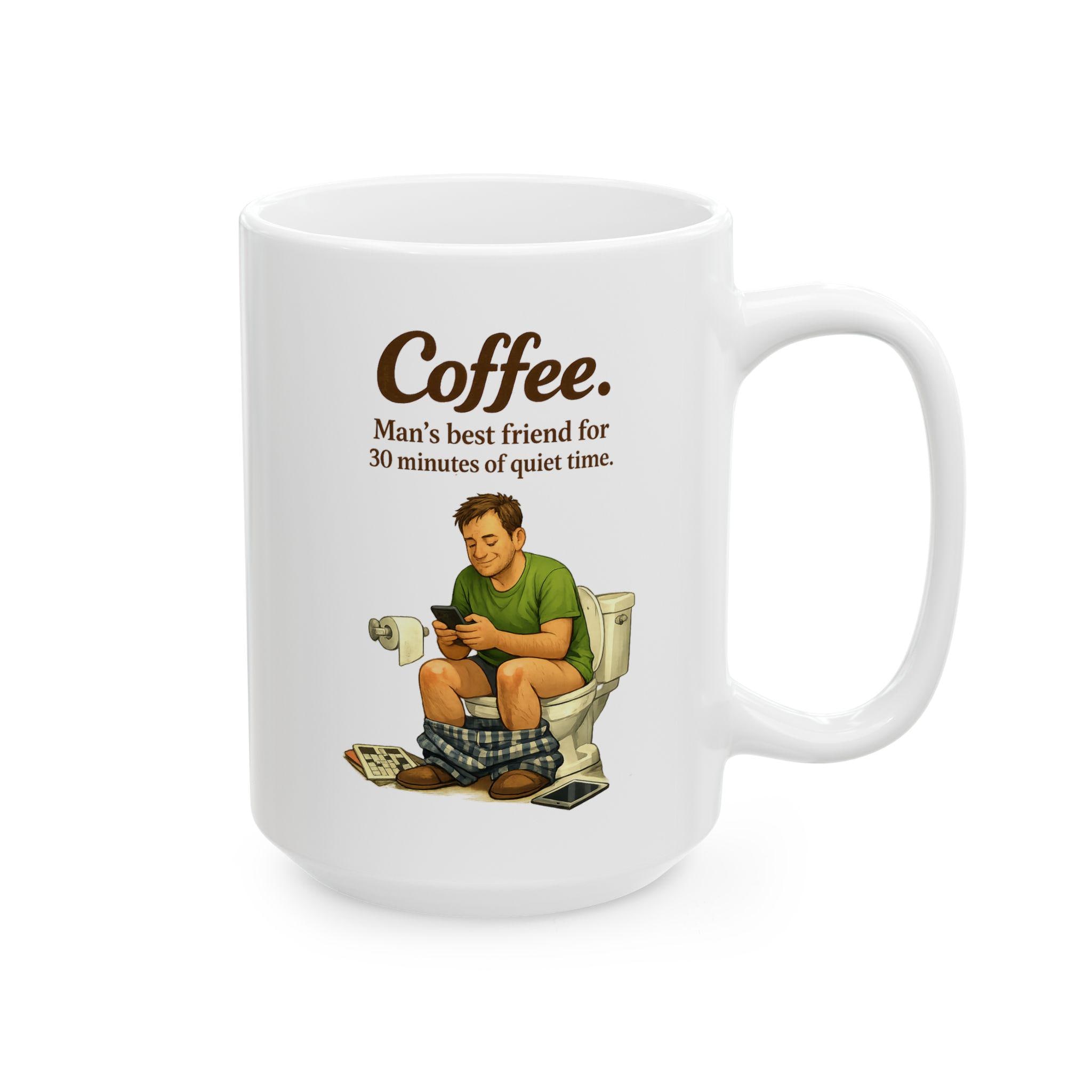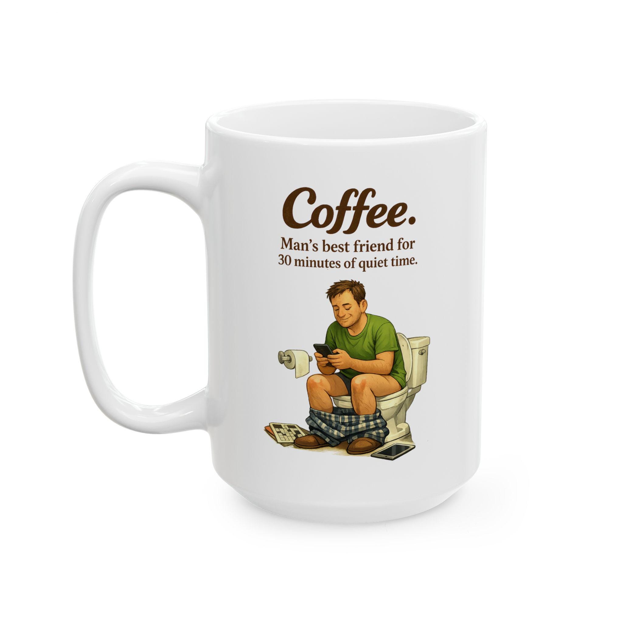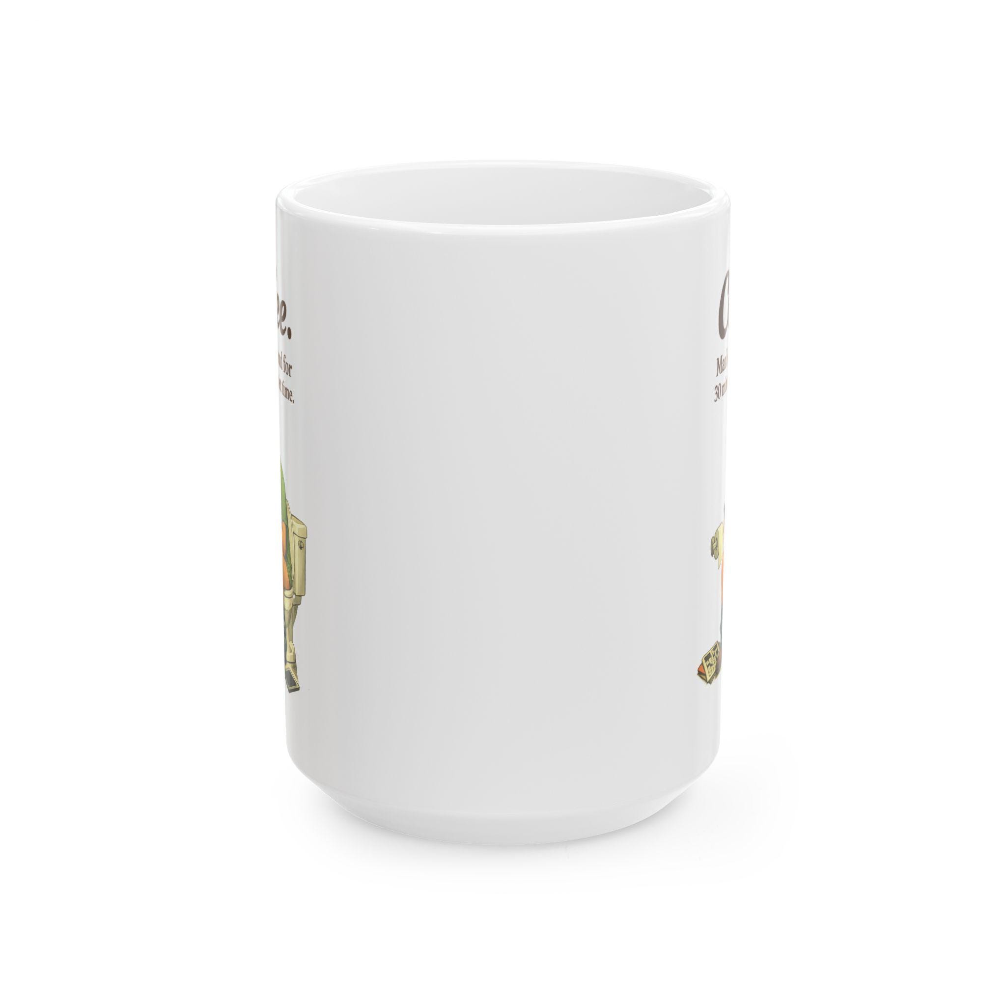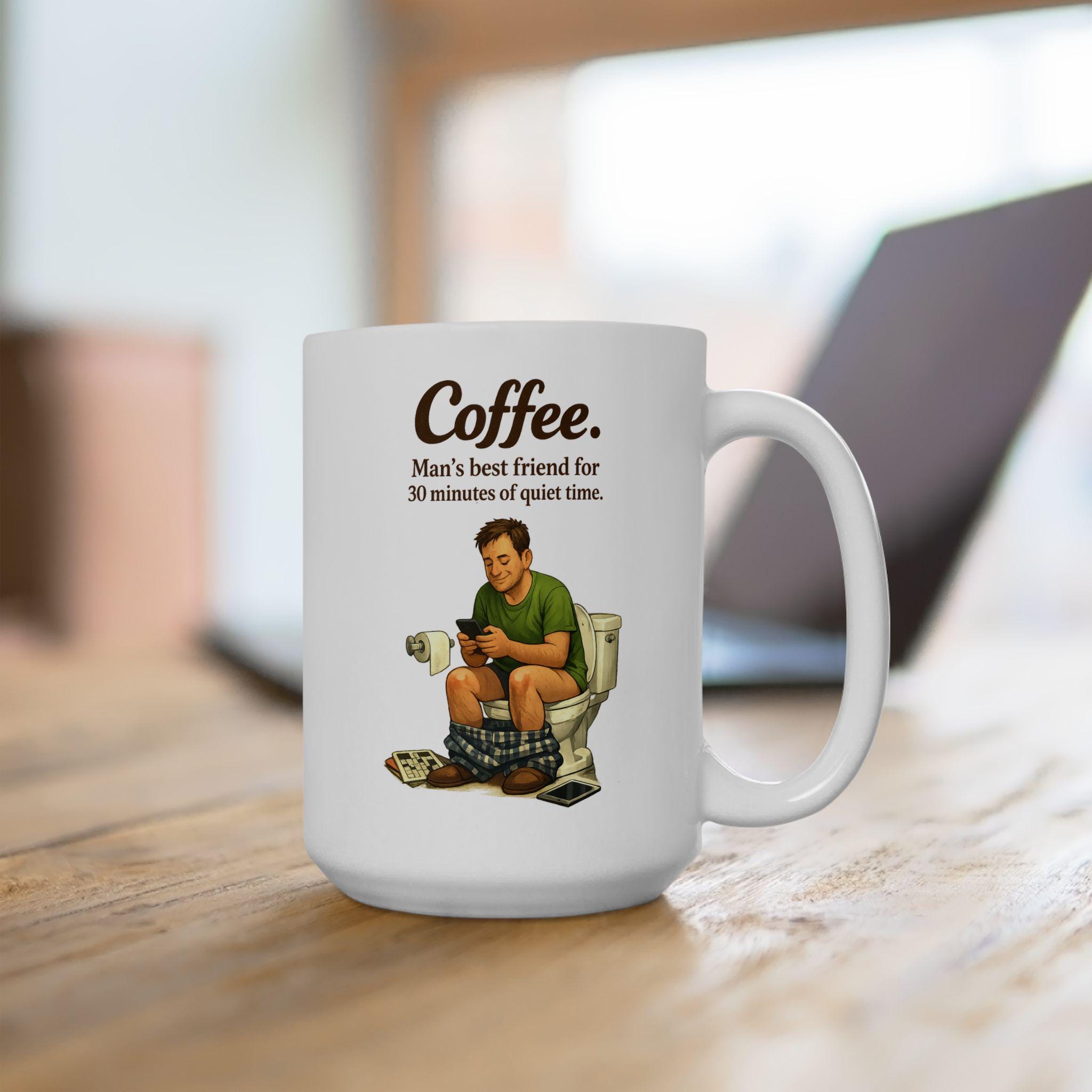 Perfectly relatable humor about morning routines bathroom breaks and the sacred quiet time that only coffee delivers.